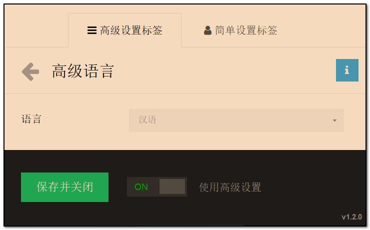 5.在面板版上找到language打开,切换到简体中文语言选项,然后点击保存并关闭即可。
