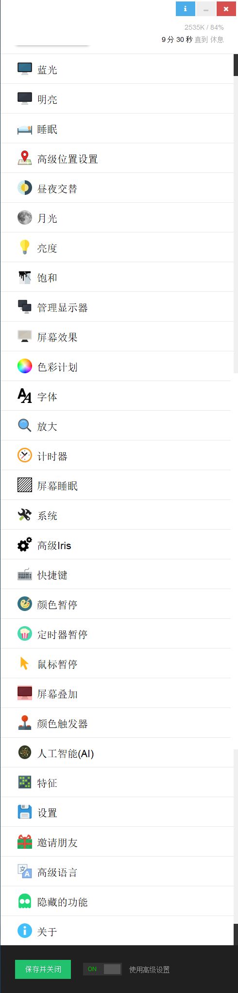 下面这个计时器功能非常实用,就是定时强制眼睛休息几秒钟,时间可以自定义设置,比如神器妹的电脑设置了每隔15分钟休息8秒钟,在到14分钟的时候,它会进入倒计时提醒,到了15分钟那个点时,屏幕会被遮罩,强迫眼睛休息。