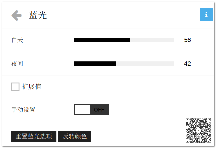7.看起来有很多选项,但是我们不必全部调整,只调整几个关键参数即可,其它的默认设置即可。比如蓝光过滤,我的设置是白天56、晚上42,大家可以根据自己的眼睛接受的舒适度来调整。