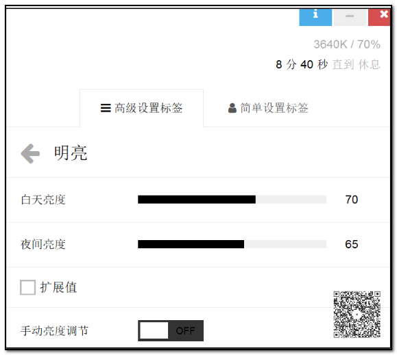 明亮度设置为白天70、晚上65,同样可以根据自己眼睛的舒适度来调整参数。
