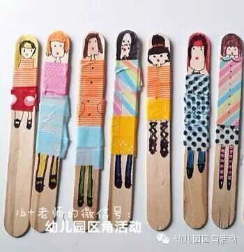 将美工区的艺术创作与自然角的装扮结合起来,让自然角成为展示孩子们艺术作品的场所,也让自然角更加立体鲜活起来。例如,用冰棒做成的小人可以插入土壤中……