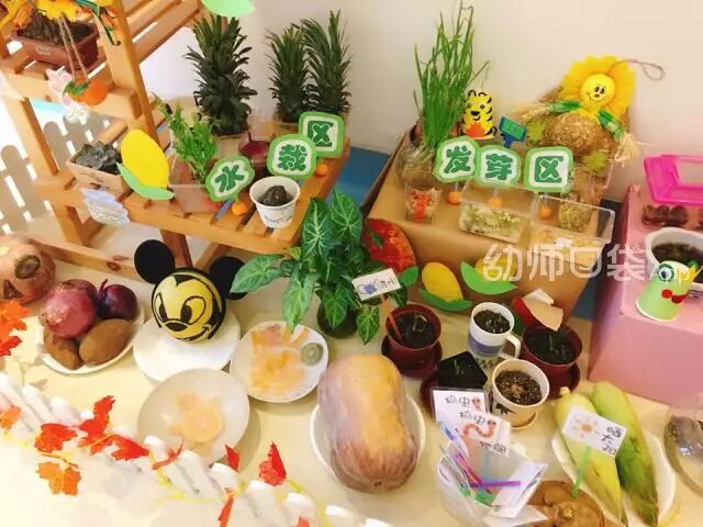 春天时自然角里最为常见的是种植类材料,让孩子了解种子的发芽过程。那到了秋天,自然角可以投放些什么呢?我们可以结合季节特征,秋天的果实、各种瓜果都可以投放在自然角,让孩子观察。