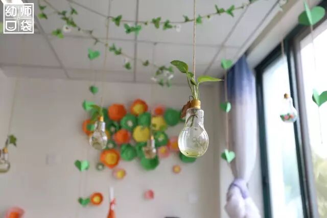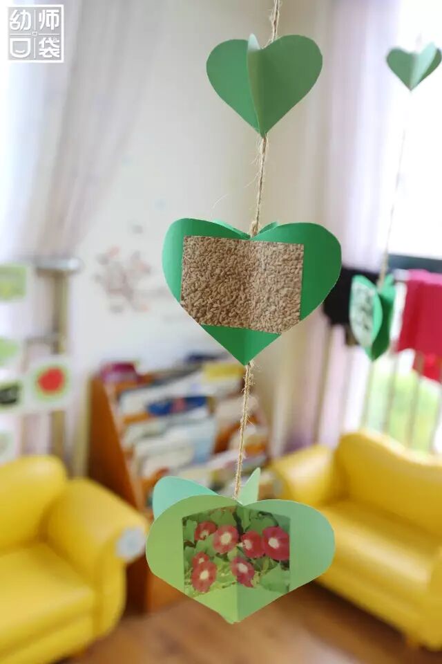 自然角的吊饰当然也要有这个区域的特色咯,绿色系的吊饰,上面贴上自然角里面的不同物种,让孩子们认识它们开花、结果的样子。