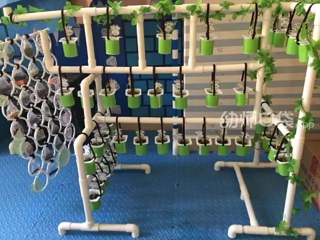 用PV管组成框架,利用废旧材料牛奶盒,把扭扭棒悬挂在管上,这样每个孩子的小盆栽都能悬挂起来,是不是看上去整洁又清晰明了呢。