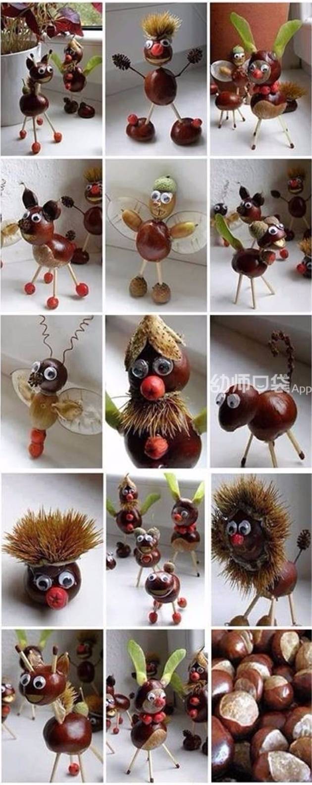 我们可以把秋天的果实作为原料,制作创意小摆件,同样这些也可以作为美工活动的材料,你不会想到孩子们可以做出什么的。