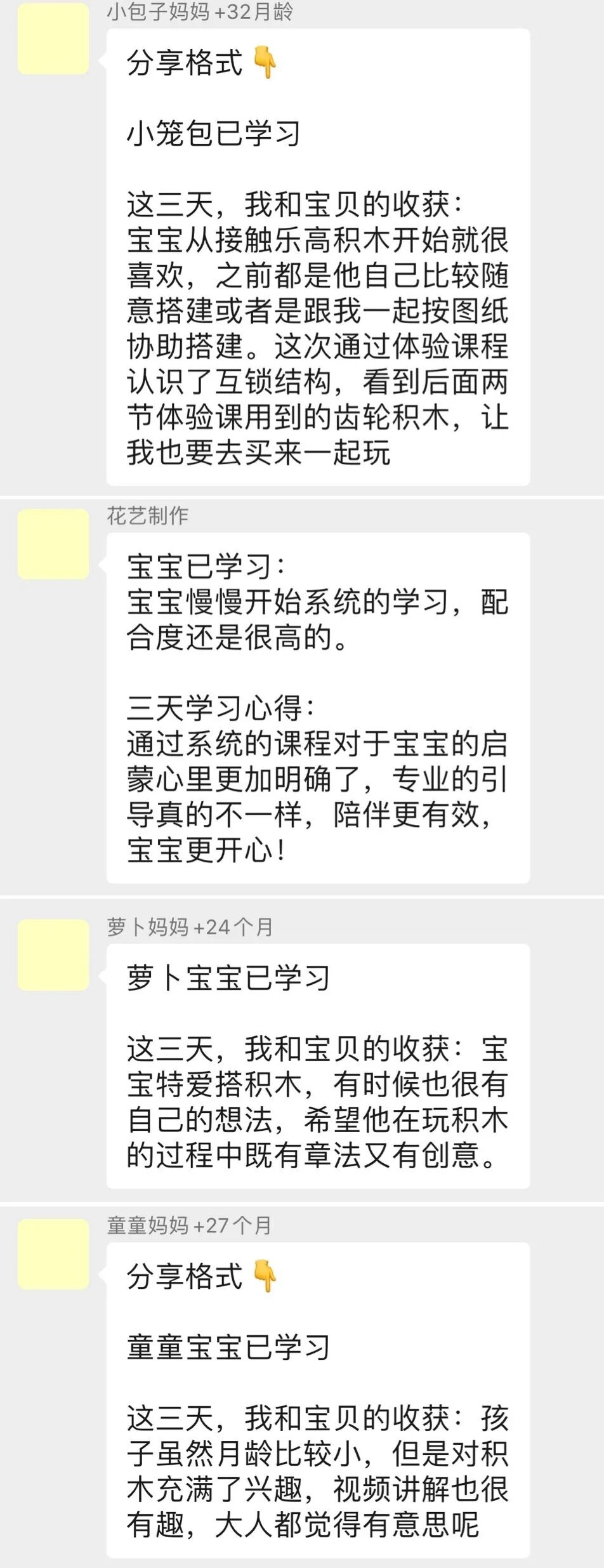 群内老师还会分享启蒙玩法,让你发现更多有趣的积木玩法,即使小龄宝宝也能无压力 hold 住!更有拼搭小技巧,让你更轻松玩转积木!