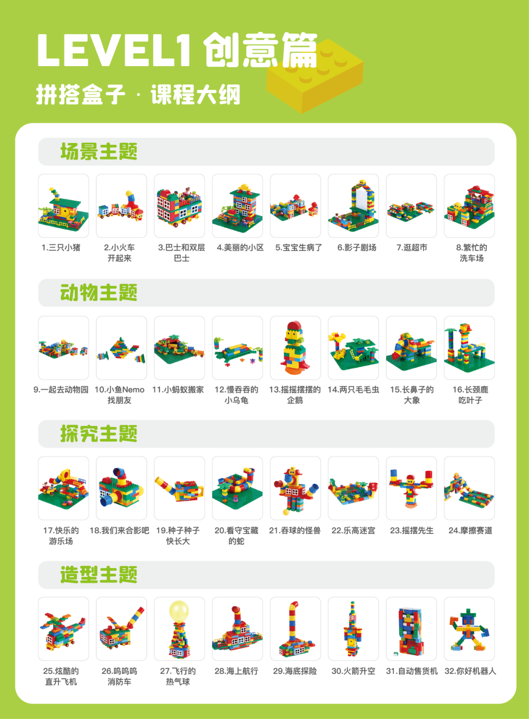 拼搭盒子,从易到难,共 112 节视频课程,从大颗粒入门,到小颗粒动力进阶,0 基础、有基础的孩子都能玩起来。