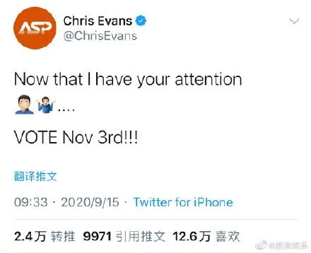 直到两天后的今天,美队才终于给出了回应:“既然我吸引到你们的注意了,那就别忘了11月3号投票”。