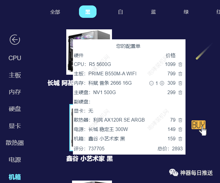 这是一个免费提供在线一键选配装机配置清单的在线工具,能够在线选择CPU、主板、硬盘、显卡等等配置,而且配置还要一键直达购买的链接,对于第一次小白装机的话非常友好了,还有价格显示。