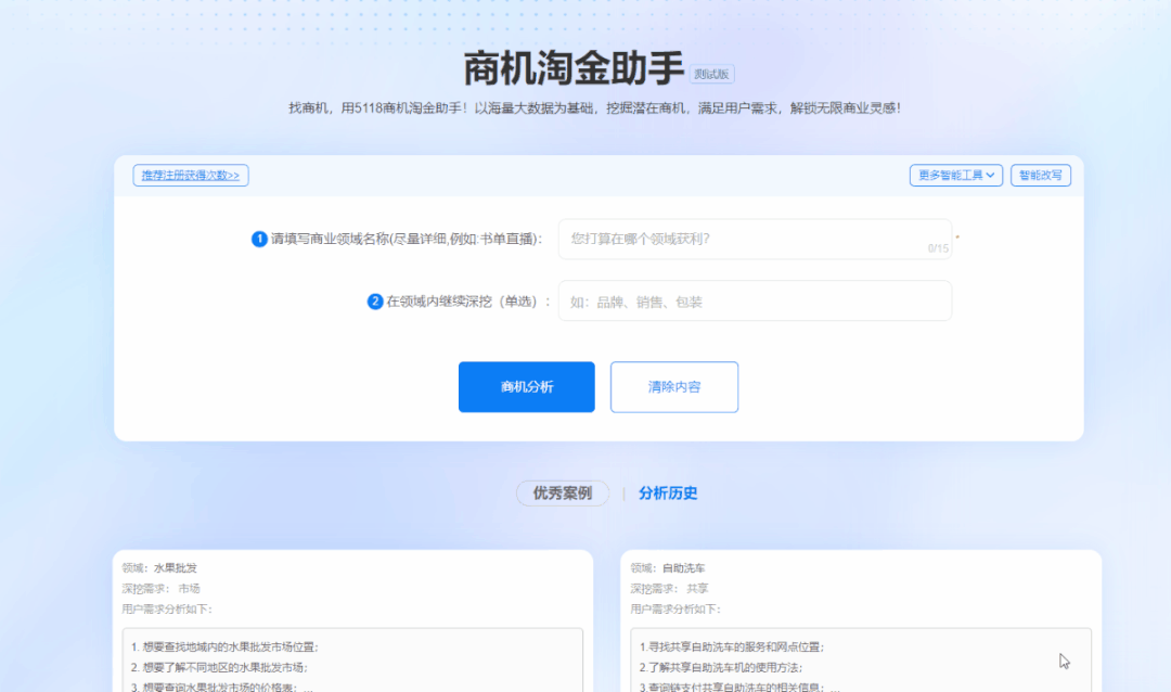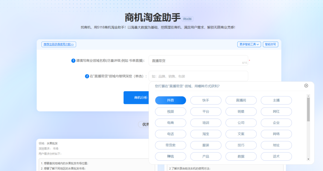 5118「商机淘金助手」,分析任意商业领域的用户需求,并对海量大数据进行挖掘,从中了解用户需求,在根据用户需求猜测出该领域所存在的潜在商业,获取无限的商机灵感