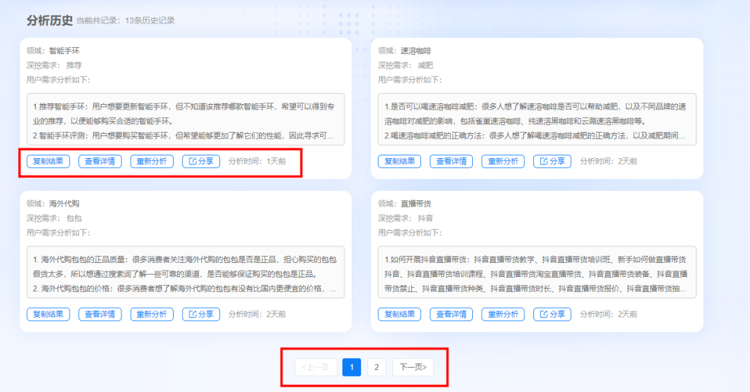 功能下方将会保存生成后的全部历史记录,便于后续查看分析过的商业领域,避免重复分析浪费使用次数