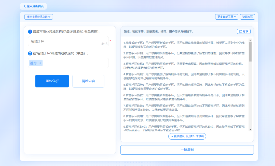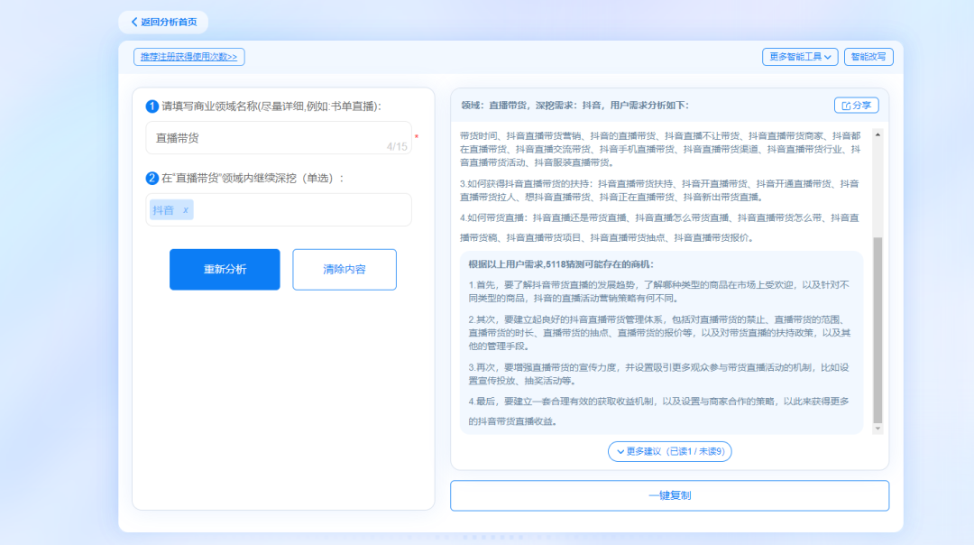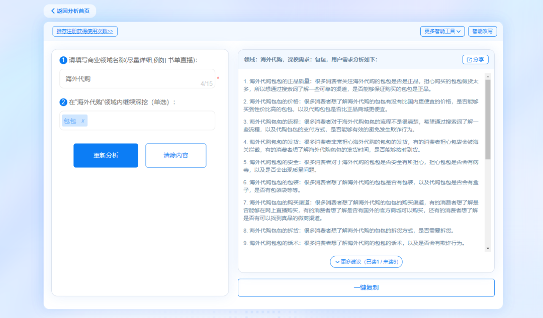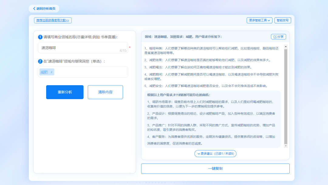 当生成分析用户需求以及该领域的潜在商机结果,对首次分析结果满意时,可以点击一键复制,保存并进行该商机内容使用