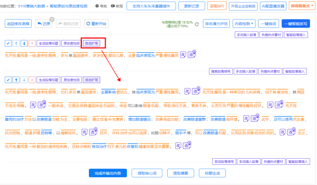 在智能改写功能中,加入自动扩写按钮,可扩写出长度为100字数的内容