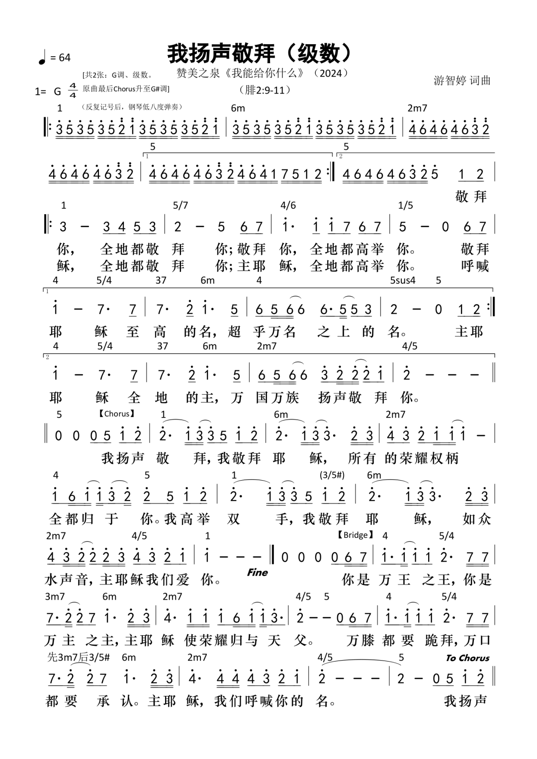 我扬声敬拜 I Lift My Voice To You 词、曲:游智婷 Sandy Yu © 2024 Stream of Praise Music / BMI. CCLI # 7238648 [Verse] 敬拜你 全地都敬拜你 敬拜你 全地都高举你 敬拜耶稣 至高的名 超乎万名之上的名 主耶稣 全地都敬拜你 主耶稣 全地都高举你 呼喊耶稣 全地的主 万国万族扬声敬拜你 [Chorus] 我扬声敬拜 我敬拜耶稣 所有的荣耀权柄 全都归于你 我高举双手 我敬拜耶稣 如众水声音 主耶稣我们爱你 [Bridge] 你是万王之王 你是万主之主 主耶稣 使荣耀归与天父 万膝都要跪拜 万口都要承认 主耶稣 我们呼喊你的名