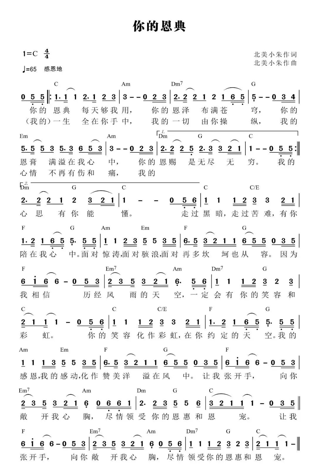 献唱:沁心小筑 烟圈蔓延 词:北美小朱 曲:北美小朱 发行:诗剑文化 你的恩典每天够我用 你的恩泽布满苍穹 你的恩膏满溢在我心中 你的恩赐是无尽无穷 我的一生全在你手中 我的一切由你操纵 我的心情不再有伤和痛 我的心思有你能懂 走过黑暗 走过苦难 有你陪在我心中 面对惊涛 面对骇浪 面对再多坎坷也从容 因为我相信 历经风雨的天空一定会有 你的笑容和彩虹 你的笑容 化作彩虹 在你约定的天空 我的感恩 我的感动 化作赞美洋溢在风中 让我张开手 向你敞开我心胸 尽情领受 你的恩惠和恩宠 我的一生全在你手中 我的一切由你操纵 我的心情不再有伤和痛 我的心思有你能懂 走过黑暗 走过苦难 有你陪在我心中 面对惊涛 面对骇浪 面对再多坎坷也从容 因为我相信 历经风雨的天空 一定会有 你的笑容和彩虹 你的笑容 化作彩虹在你约定的天空 我的感恩 我的感动 化作赞美洋溢在风中 让我张开手 向你敞开我心胸 尽情领受 你的恩惠和恩宠 让我张开手 向你敞开我心胸 尽情领受 你的恩惠和恩宠