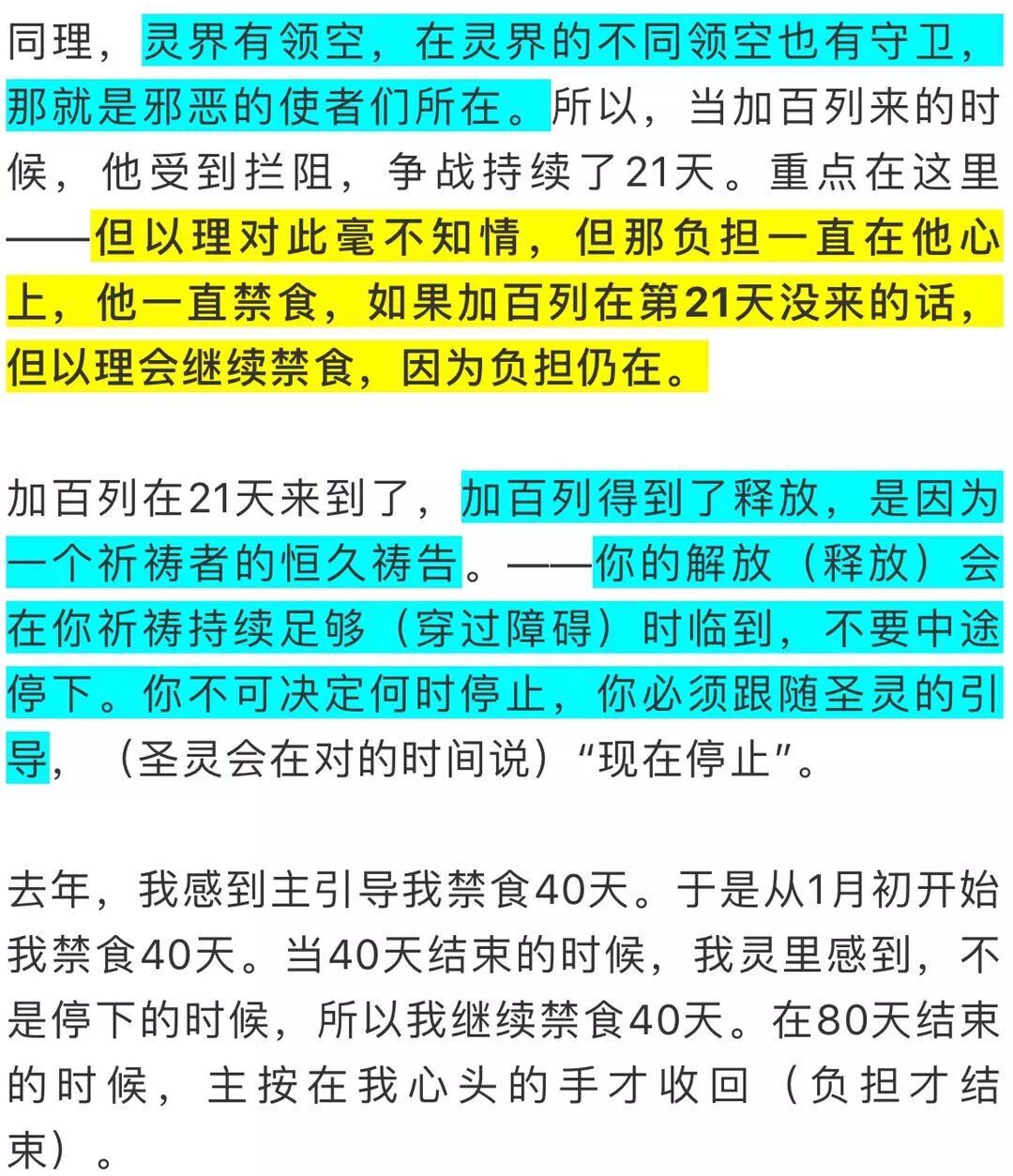 一个好例子:但以理10:1 但以理先知读到耶利米先知的预言,就立志在心里,要寻求这预言将何时应验。于是他感到神的灵的引导,要为此禁食、祷告。经文告诉我们,他是巴比伦的总理,所以无法休假21天,所以,他当时一边工作、一边禁食,但如果你空着肚子去工作,可能在工作中睡着,连敲键盘也没力气。