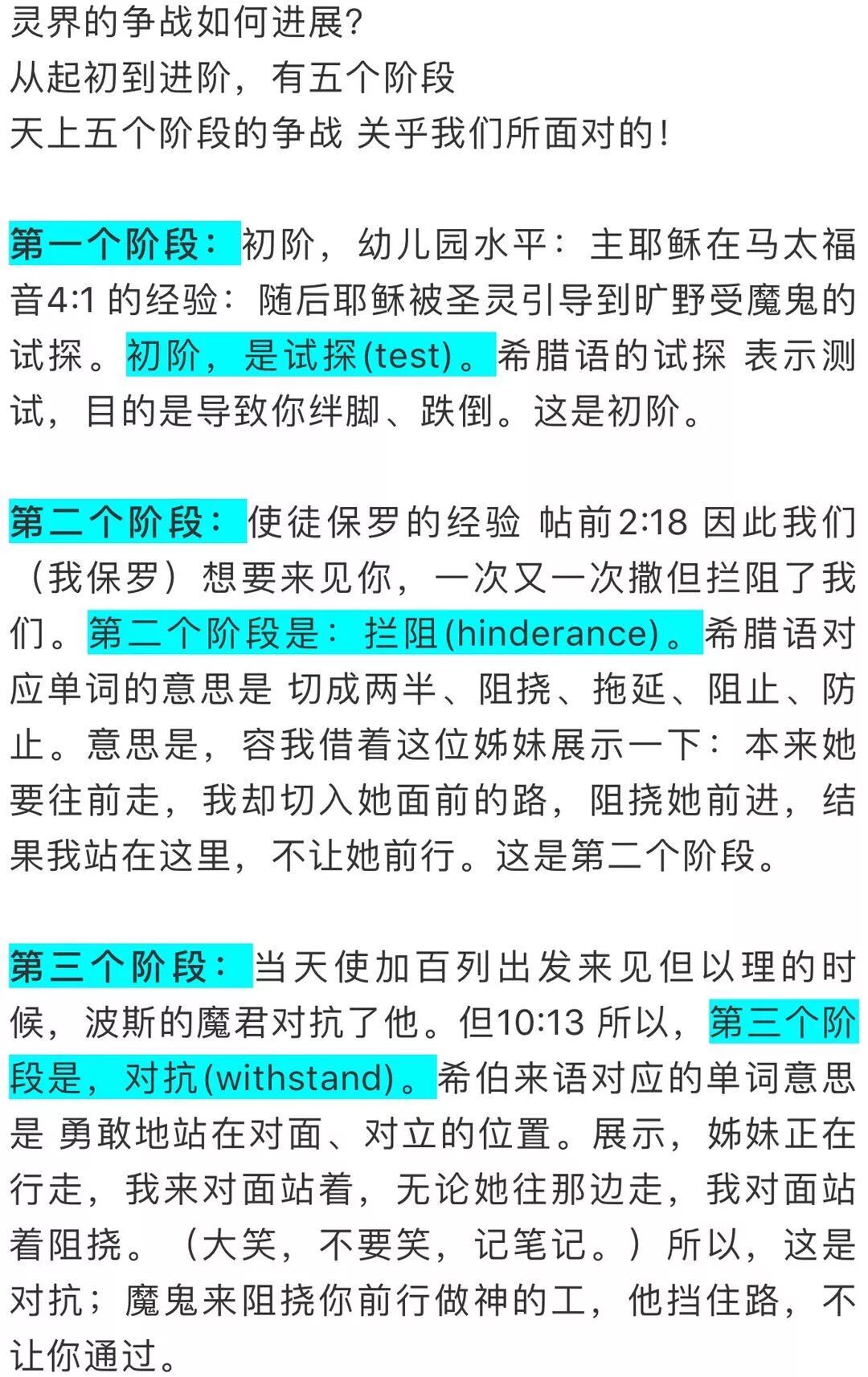 第四个阶段:末世信徒的经验,以弗所书,我们不是与属血气的争战。第四个阶段是:摔跤。你见过电视上的摔跤吗?那种是会把人扔在地上,拿椅子来打人——不是那种。希腊语摔跤意思是,暴力地把对方扔下去。这是肉搏战——魔鬼可能抓住你,暴力地摇晃你、把你扔下去。很暴力的、很强的。这个阶段是很强的争战。