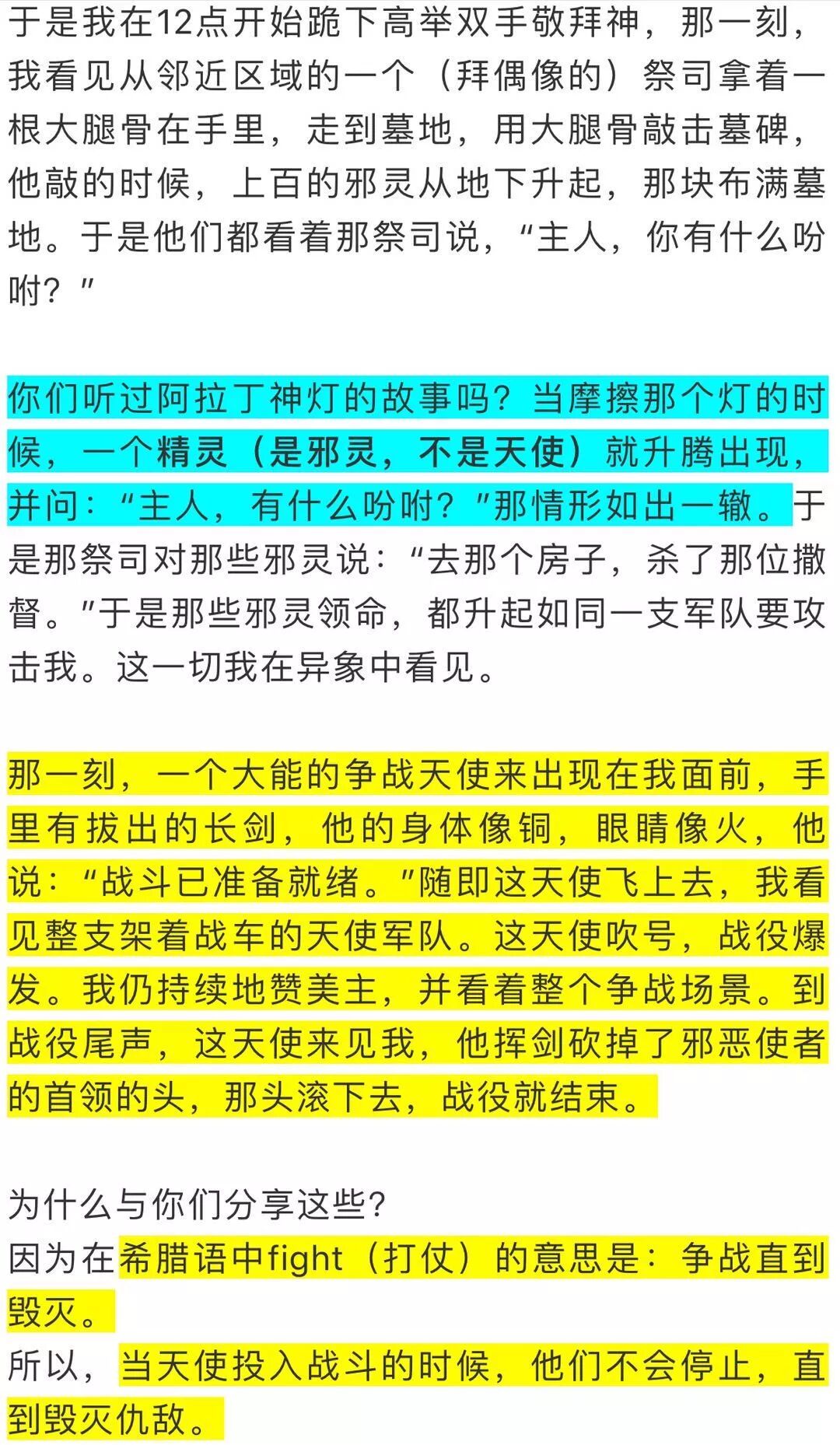 分享1985我的一个经验:主呼召我禁食七天,是全禁,主告诉我不能喝茶也不能喝咖啡,只能一天喝一杯牛奶。当时我不知道为何禁食。到第五天,我接到一个电话,来自一个被巫术搅扰严重的家庭,他们即将自杀,因为找不到能帮助他们的人。绝望中,他们在报纸上读到我的事情,就打电话给我,请我去帮助他们。接到这个电话时,我听到主的声音说:“这就是我吩咐你禁食七天的原因,去释放这个家庭。”